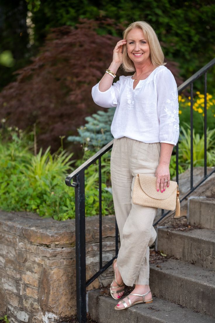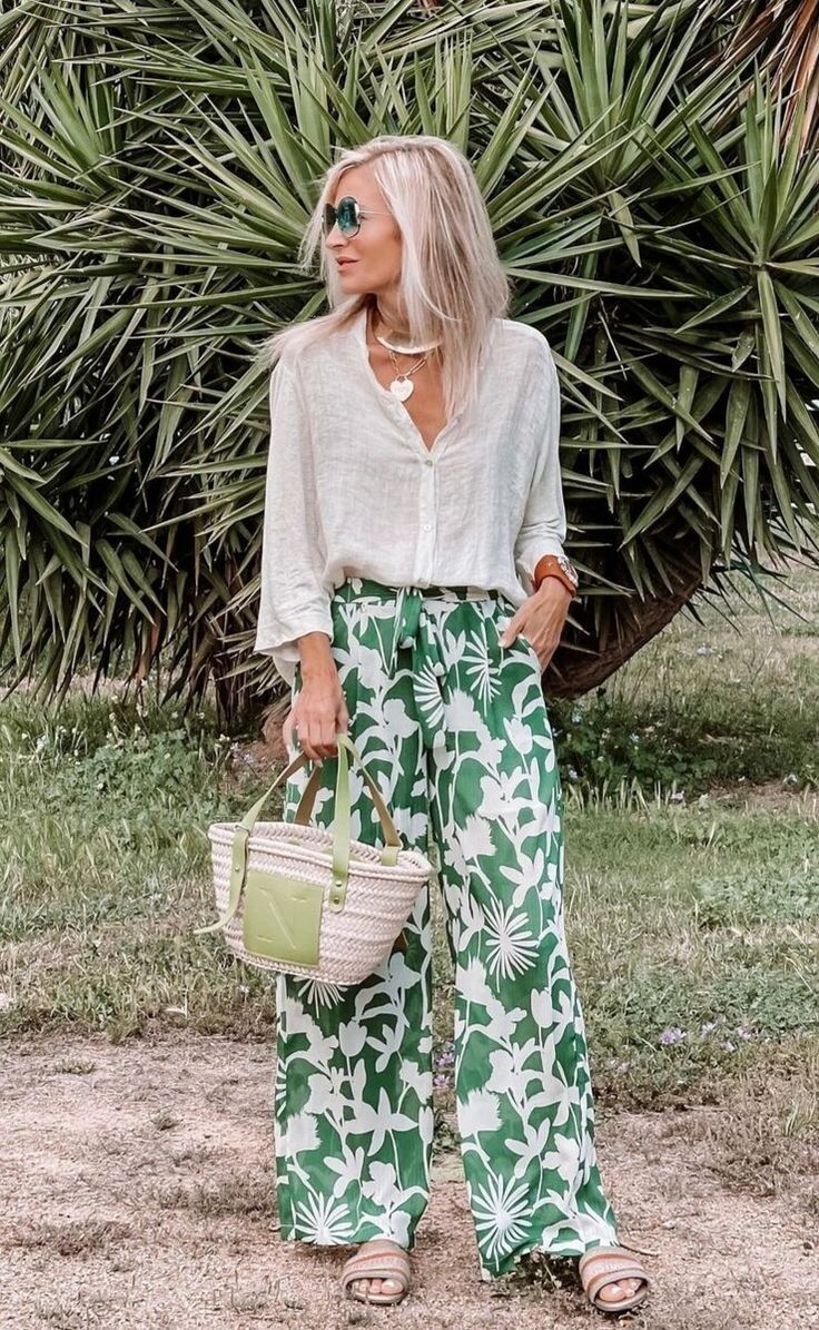 An ode to timeless style and breathable fabrics, this image showcases an ensemble that marries comfort with summer outfits women over 50 casual elegance. The loose-fitting white shirt and linen trousers are a nod to the laid-back nature of summer outfits women over 50 hot weather fashion.