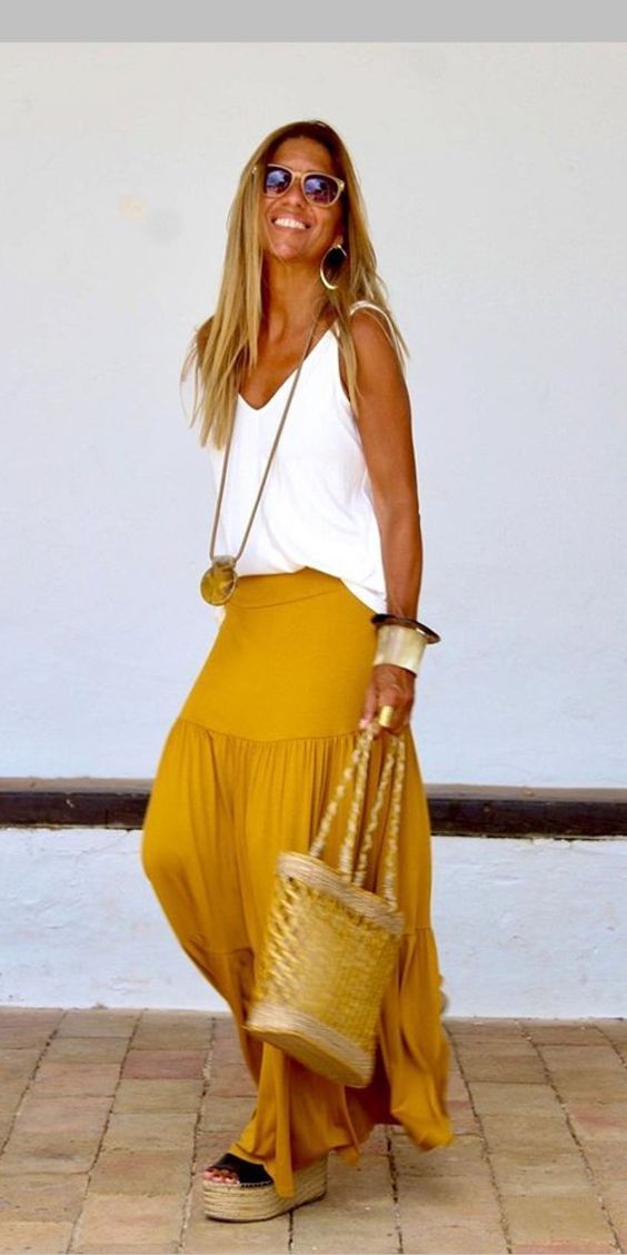 As the sun blesses us with its warm embrace, the summer outfits women over 50 begin to take on a vivid and carefree character. This image captures a woman standing by a tranquil body of water, embodying the spirit of summer in a vibrant, ankle-grazing maxi skirt. The bold print swirls with life, speaking of joyous days spent under the sun.