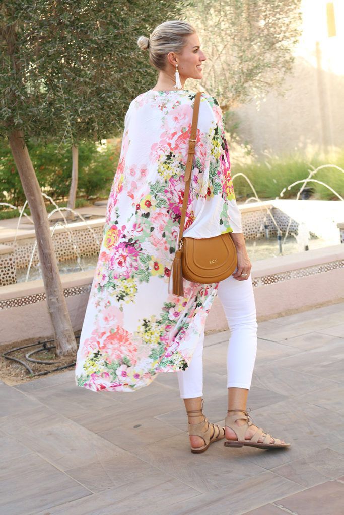 Nothing says summer outfits women over 50 classy like a well-assembled ensemble that speaks of worldly charm and relaxed elegance. Here, a woman stands, radiating confidence in a bohemian-inspired kimono paired with classic denim—a testament to the timeless nature of summer outfits women over 50 fifty not frumpy casual.