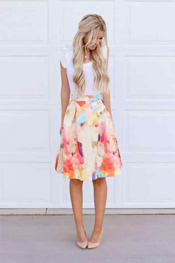 Brighten up your Easter with a vibrant yellow midi skirt decorated with a floral pattern. Teamed with a simple white tee and sneakers, it’s an outfit that screams cute easter outfits for women casual. It’s stylish, effortless, and just right for a relaxed Easter Sunday.