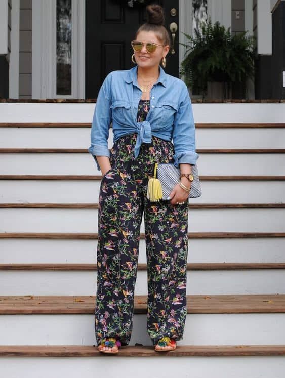 Nothing says Easter like a pair of floral pants, paired with a knotted denim shirt. This outfit is as fun as it is functional, making it a great choice for an active Easter day spent with kids or family, embodying the easter outfits for family vibe.