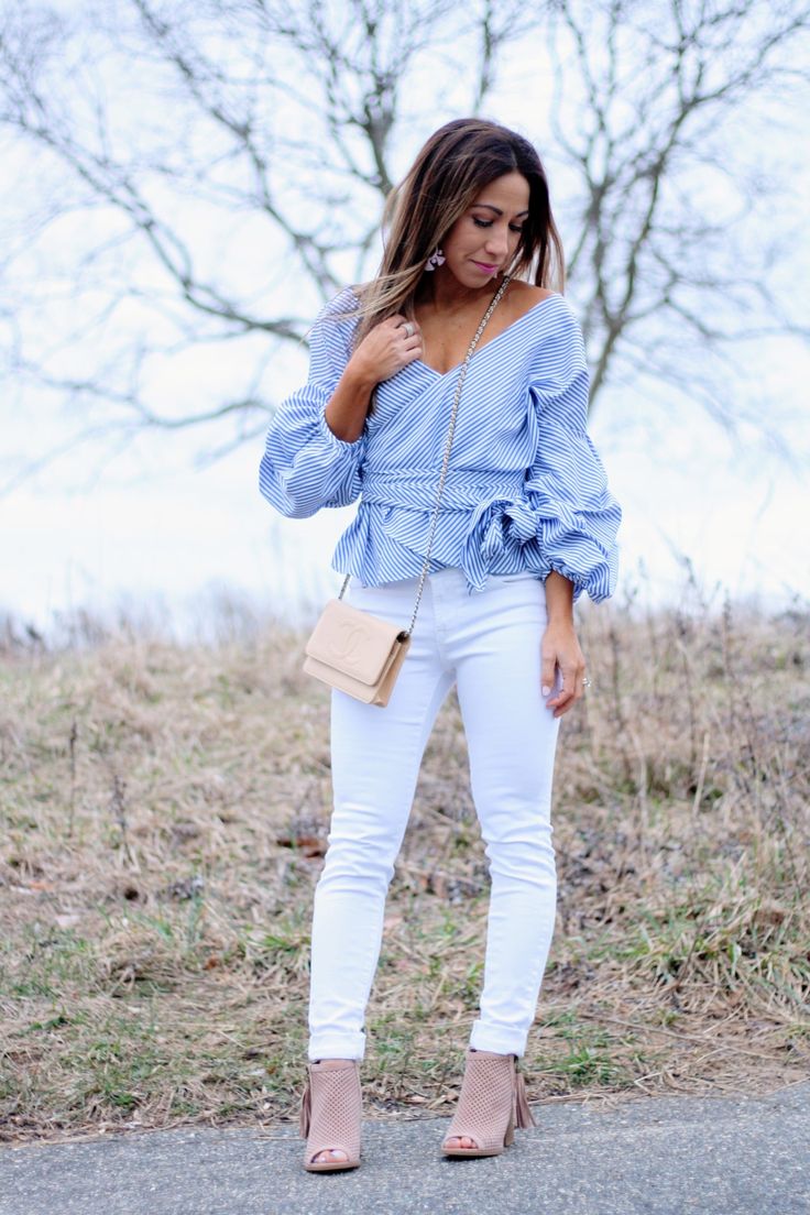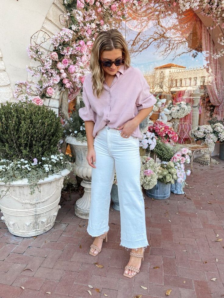 Take a leisurely stroll on Easter weekend in a pastel lavender shirt paired with white denim. This ensemble is the essence of spring – light, airy, and undeniably stylish, perfect for a casual yet trendy easter outfit for women.