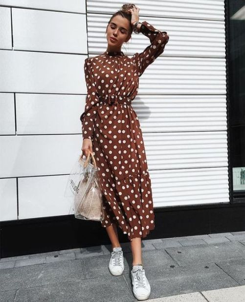 A brown polka dot midi dress merges timeless style with contemporary comfort. This look is versatile enough for an Easter brunch or a day of shopping. Paired with classic white sneakers, it’s an easter outfits for women pick that’s equal parts playful and practical.