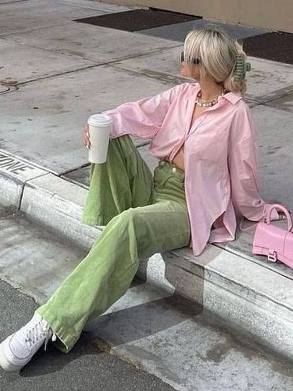 Street style doesn’t take a holiday, and neither should you. Envision a relaxed pastel pink shirt unbuttoned over a casual crop top, paired with high-waisted pistachio green trousers. The combination is an ideal easter outfits for women casual, suitable for a laid-back day out or a cool, casual family event. White sneakers and a pink bag add a pop of coordinated color to this trendy and comfortable outfit.