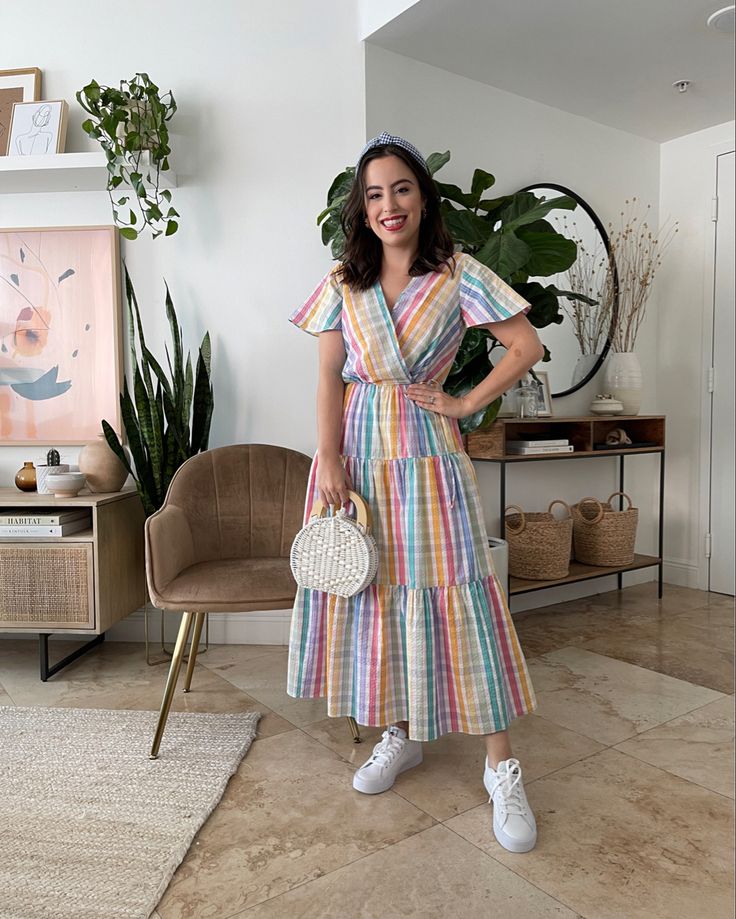 For a family gathering or an intimate brunch, think of something comfortable yet undeniably stylish. A midi dress with a wrap design, adorned with cheerful stripes in easter egg hues, pairs wonderfully with crisp white sneakers. It’s the epitome of a casual and trendy approach to easter outfits for women casual.