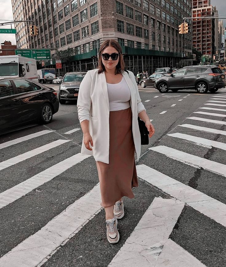 For the woman navigating the busy streets of city life, this outfit is a blend of sophistication and spring-ready comfort. A long white coat drapes elegantly over a simple top and a rust-colored midi skirt, creating a professional yet approachable look. Paired with chunky sneakers, it’s a perfect example of spring outfits midsize office fashion that can transition seamlessly into a weekend brunch ensemble.
