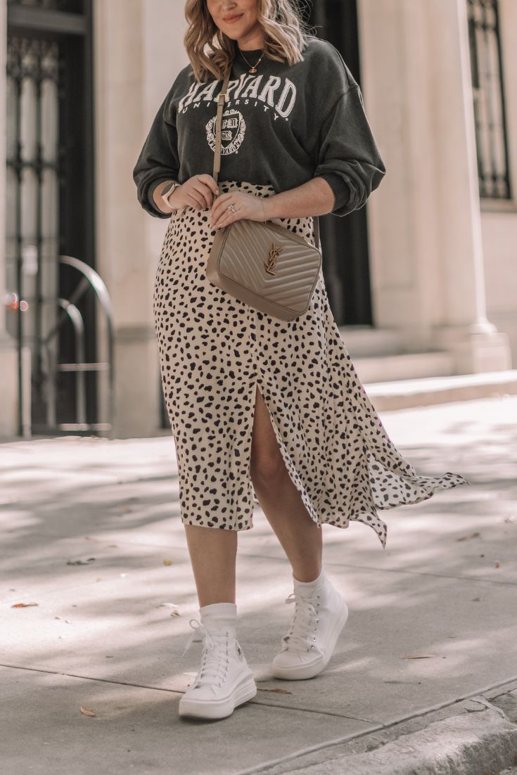 Who says casual can’t be stylish? This look throws the rulebook out the window with a playful mix of a graphic sweatshirt and a polka dot skirt. It’s a creative take on spring outfits midsize casual wear, allowing for personality to shine through while maintaining comfort. The high-top sneakers add an urban edge, perfect for those early spring days when the weather might still have a hint of cold.