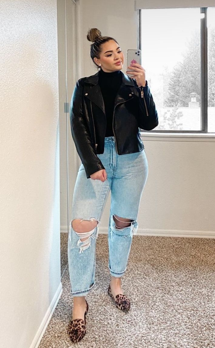 This outfit exemplifies how layering and texture can create a look that is both alt and chic. A sleek black turtleneck lays the foundation for a distressed denim and a leather jacket, proving that spring outfits for midsize women can be edgy and elegant. The leopard print flats offer a pop of pattern to spice up the outfit, making it suitable for a day at the school or a casual outing.
