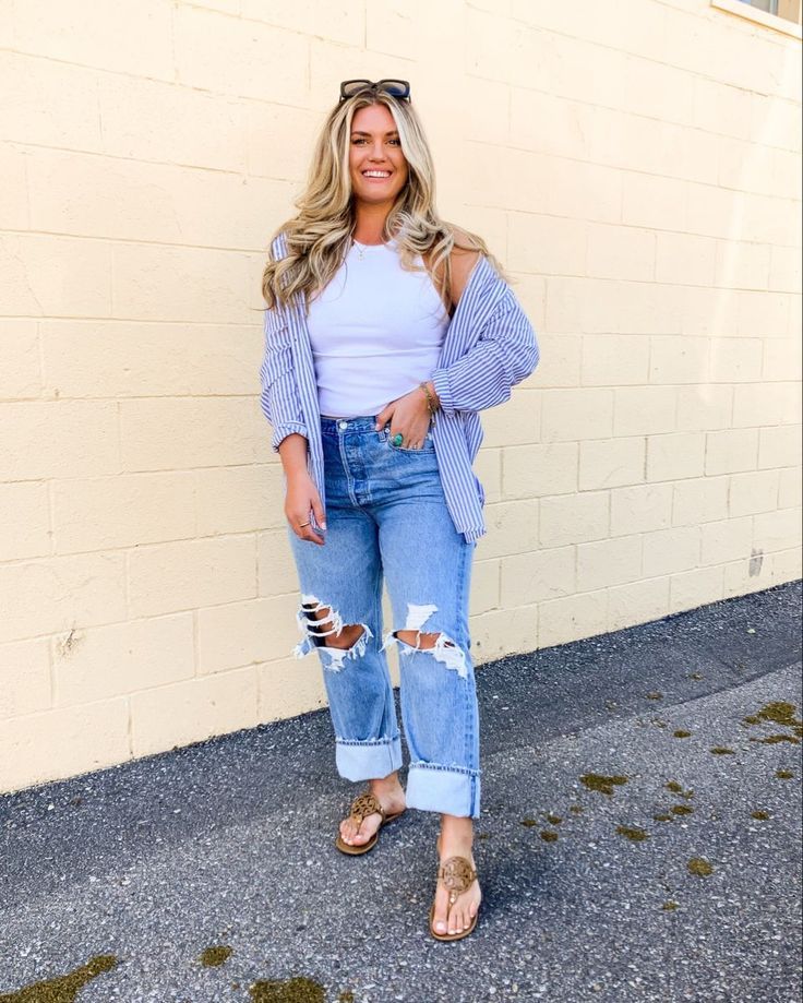 Spring is the perfect time to bring out those distressed jeans and pair them with a classic striped shirt. This outfit radiates a casual but cute vibe, ideal for spring outfits midsize school runs or a day out shopping. The sandals with a hint of animal print add a playful touch to this spring outfit for midsize women.