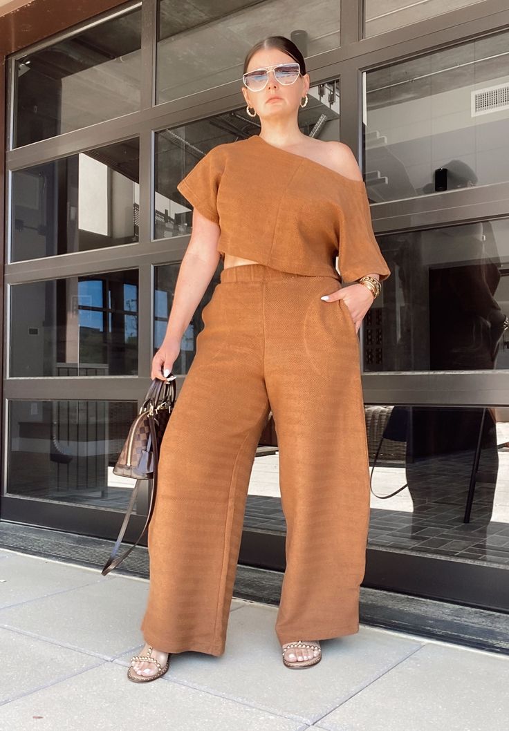 As temperatures rise, one-shoulder tops make their comeback. This bold rust-colored ensemble is a standout choice for spring outfits midsize women looking to make a statement. The wide-legged pants and one-shoulder top celebrate the body with a modern silhouette, accessorized with minimalist jewelry and embellished sandals for a touch of glamour.