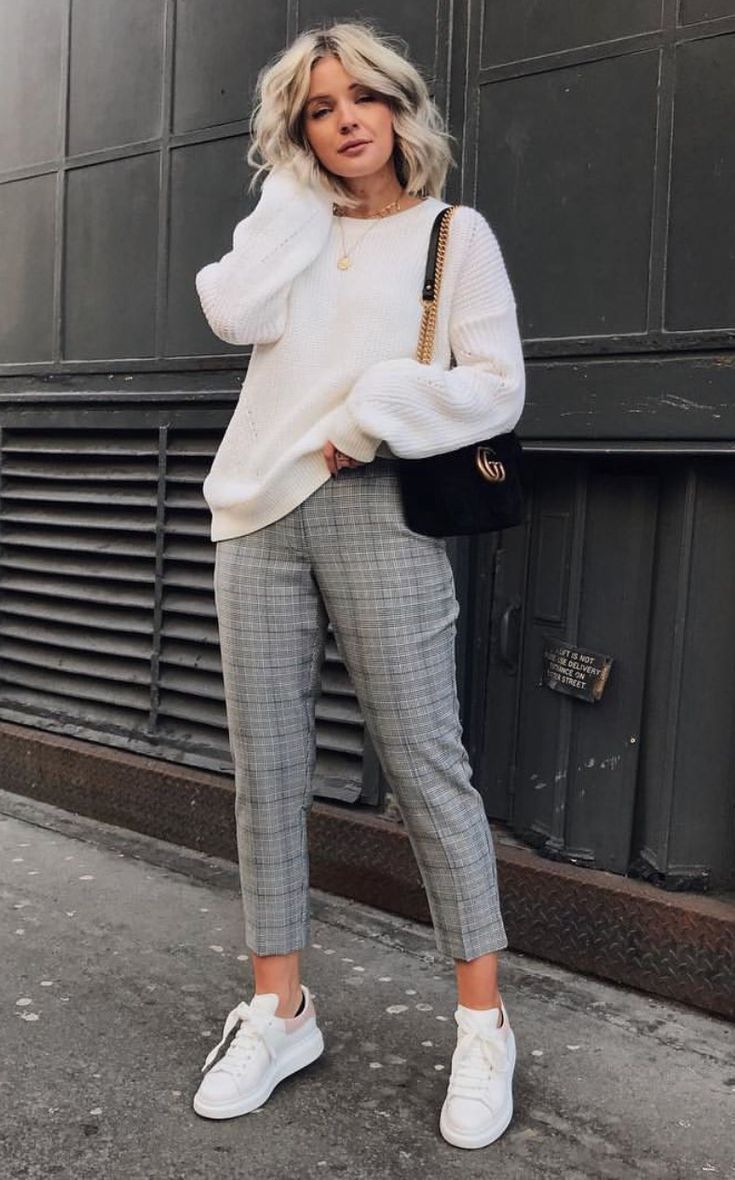 Transitioning from winter to spring can be a fashion challenge, but this outfit strikes the perfect balance with a cozy white knit sweater and plaid trousers. The sweater’s oversized fit paired with the cuffed, ankle-length trousers creates a silhouette that flatters a midsize body. Accessorized with white sneakers and a classic black shoulder bag, this is a staple spring outfit for midsize work environments that can be easily adapted for a school setting or a coffee date.