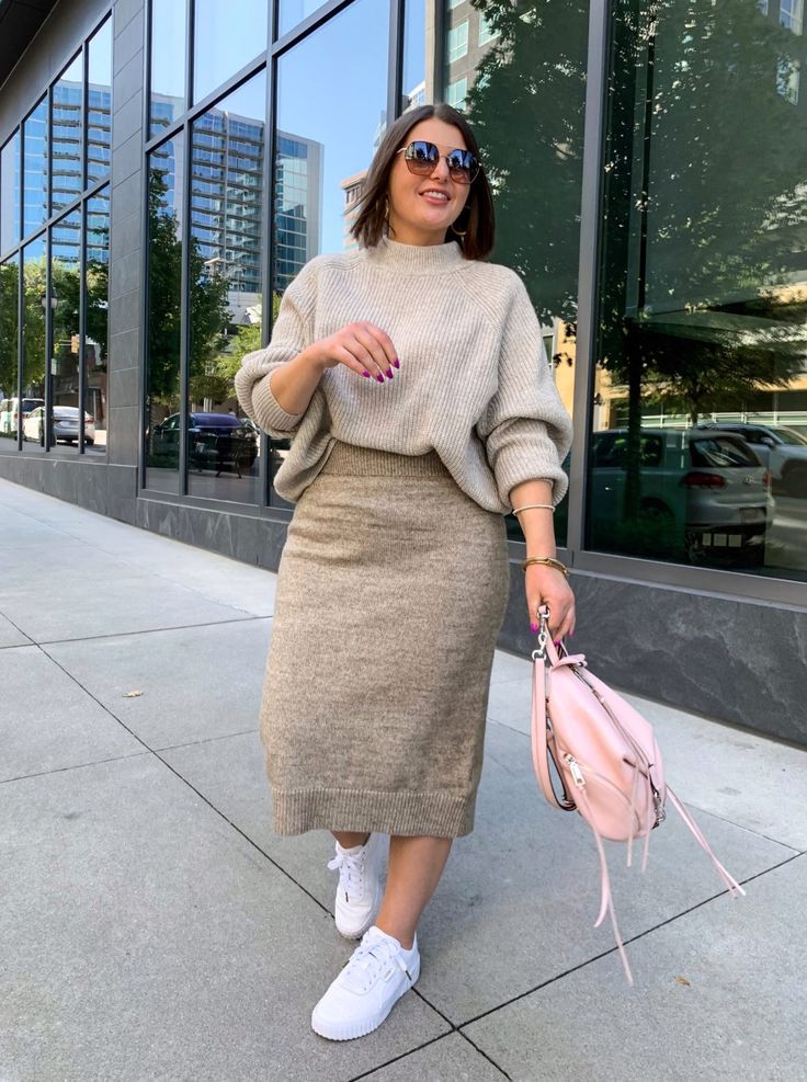 A monochromatic outfit can speak volumes, especially when executed with thoughtful layering and texture. This ensemble uses shades of beige in a chunky knit sweater and a ribbed midi skirt, creating a fluid, sophisticated look for midsize work or play. The crisp white sneakers keep the outfit grounded and approachable.