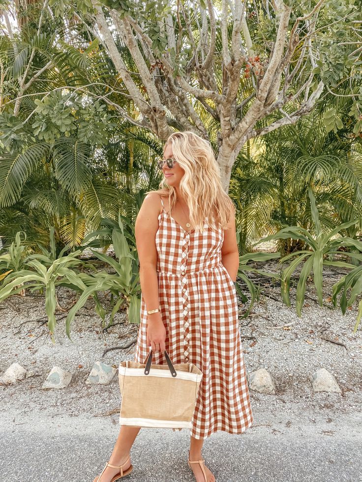 The checkered dress in this look is a spring delight, perfect for those glorious sunny days. Its sleeveless design and flowing skirt make it a go-to spring outfits midsize dress option, ideal for picnics or outdoor brunches. Styled with a simple tote and strappy sandals, it encapsulates the ease of spring outfits for midsize women.
