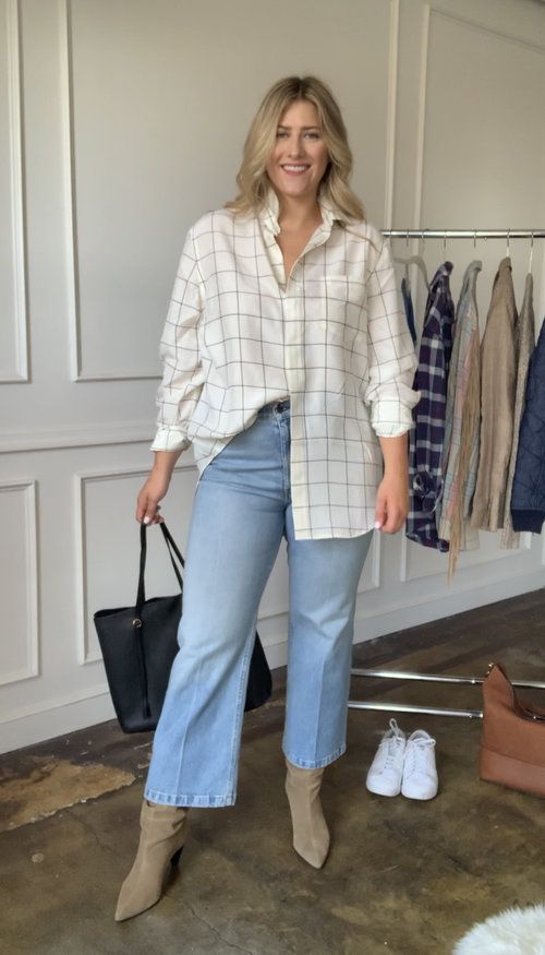 This look features a white checked blouse paired with high-waisted denim, creating a balance between comfort and urban chic. It’s a versatile choice for spring outfits midsize work days or a laid-back weekend. The boots add an edge to the outfit, making it ideal for those unpredictable early spring days when the weather can still be a bit cold.