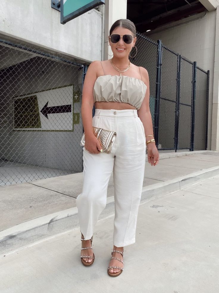 Neutral tones get a sophisticated update in this structured outfit. The beige crop top is a playful counterpart to the high-waisted white trousers. This look is a stylish choice for spring outfits midsize office settings or after-work drinks, proving that midsize work attire can be both professional and trendy.
