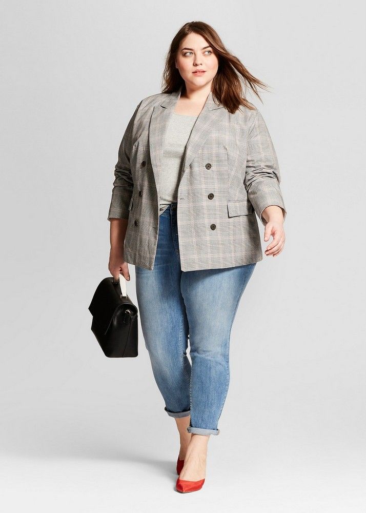 A gray checked blazer over a casual tee with blue jeans strikes the perfect balance between classic and contemporary. The red heels add a welcome burst of color, making this outfit a go-to for spring outfits plus size casual jeans days that require a touch of sophistication.