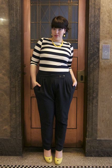 Stripes make another appearance, showcasing their timeless appeal in spring outfits plus size fashion. This look pairs a black-and-white striped top with tailored black trousers, accented by a pop of color with mustard yellow heels, perfect for adding a little spring outfits plus size casual brightness to any outfit.