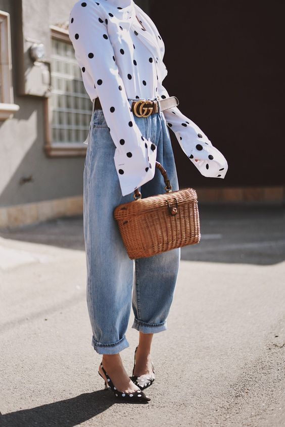 The quintessence of spring is captured in a playful polka dot blouse, cinched at the waist with a statement belt, flaunting the iconic GG buckle. Paired with relaxed boyfriend jeans, it’s a blend of feminine charm with a laid-back vibe. The ensemble is accessorized with a structured wicker bag and pearl-studded flats, creating a harmonious balance between casual and chic—a baddie spring outfits casual look that’s effortlessly stylish.