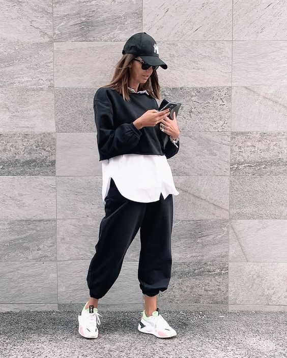 For the woman who appreciates comfort without sacrificing style, this outfit pairs a classic sweatshirt layered over a crisp white shirt with tapered sweatpants. The ensemble is topped off with a baseball cap and fresh white sneakers with neon accents, perfect for a baddie spring outfits casual day out or a relaxed hangout with friends.