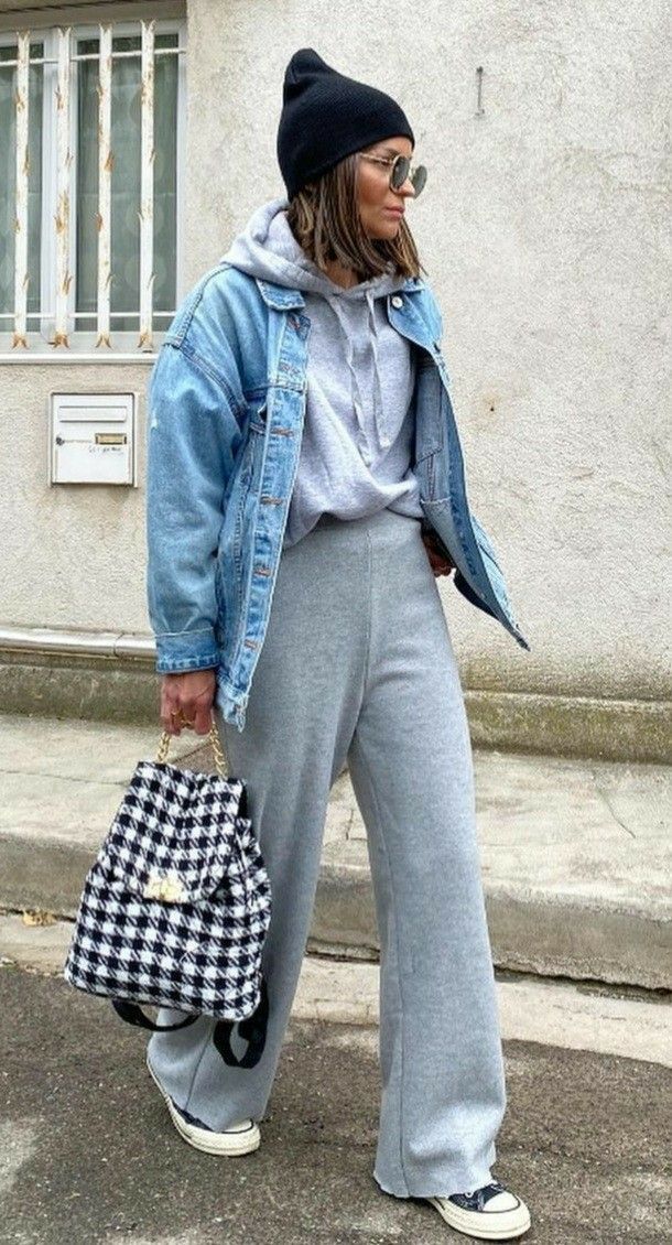 Spring’s unpredictable weather calls for versatile layers. Here, a denim jacket is casually draped over a hoodie, paired with wide-leg sweatpants for a relaxed yet put-together look. A beanie adds an urban touch, and the houndstooth bag introduces a patterned contrast, showcasing how baddie spring outfits casual can also be layered and fashionable.