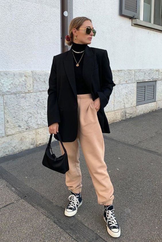 This ensemble speaks to the modern woman who strides with purpose. A classic black blazer and camel sweatpants merge tailored formality with relaxed comfort, grounded by timeless high-top sneakers. It’s a baddie spring outfits casual yet sophisticated choice, ideal for a transitional spring wardrobe.