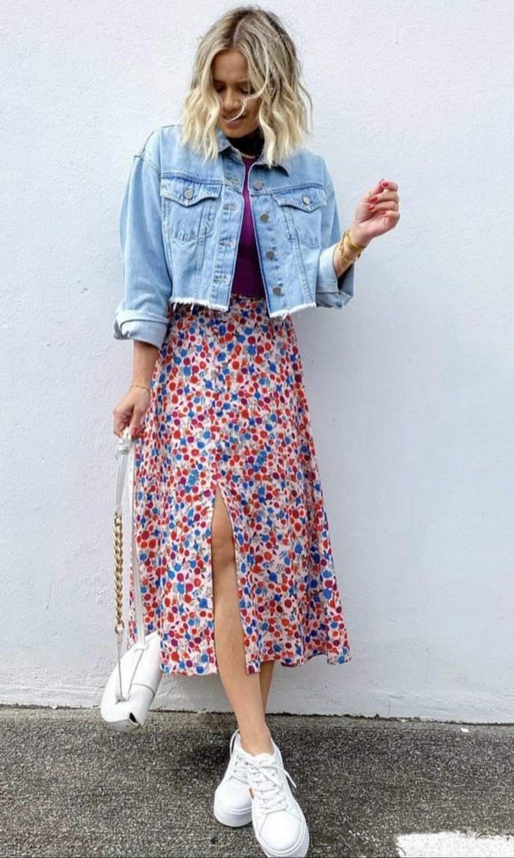 Spring and florals are a timeless match. This mid-length dress adorned with vibrant colors is paired with a denim jacket, combining soft femininity with a structured edge. White sneakers add a casual, comfy finish, ideal for a baddie spring outfits casual brunch or a day in the city.