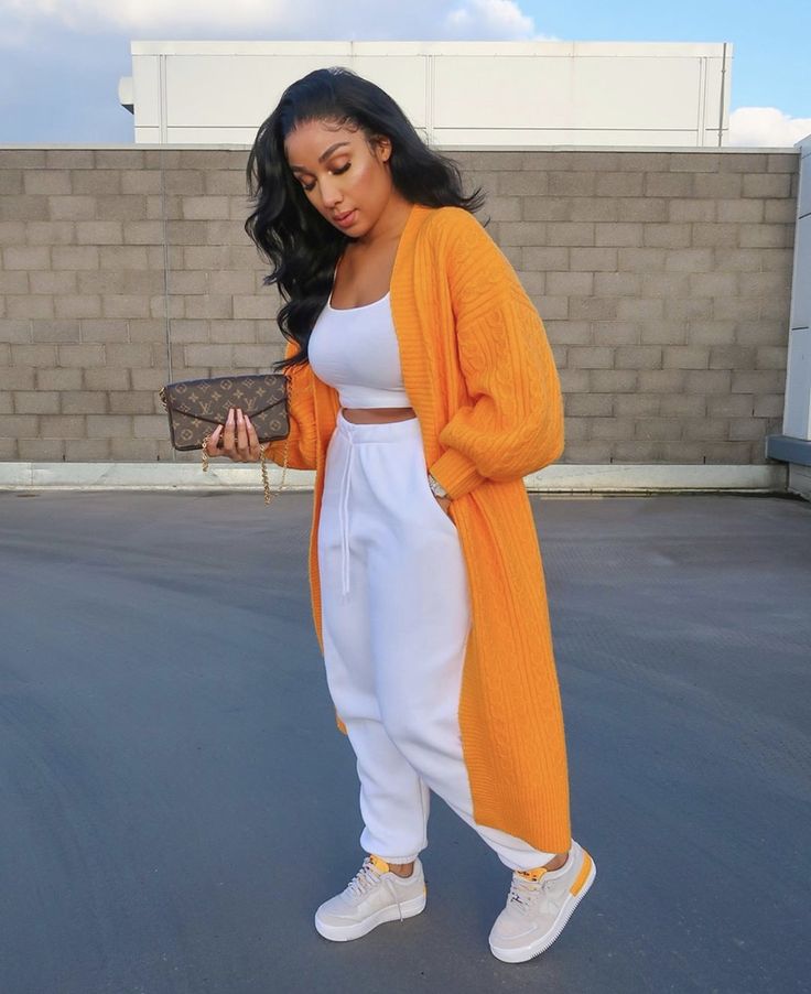 For those cooler spring days, a chunky knit cardigan in a vibrant hue pairs beautifully with a sleek white ensemble underneath. The outfit, complete with casual sneakers, marries comfort with a pop of color, embodying a baddie spring outfits casual vibe that’s also cozy.