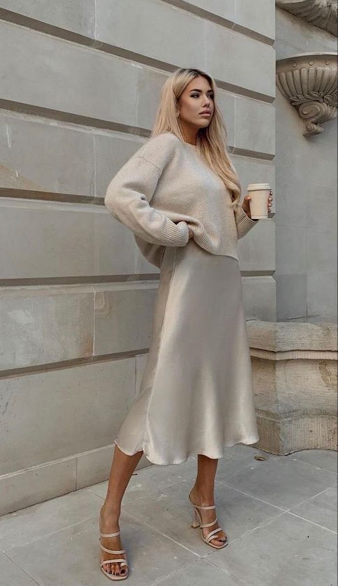 Neutral tones offer a canvas for sophistication. Here, a creamy knit sweater pairs with a flowing skirt, accessorized with minimalist sandals, exuding effortless elegance. It’s a look that can transition from day to night, perfect for the baddie spring outfits casual yet chic aesthetic.