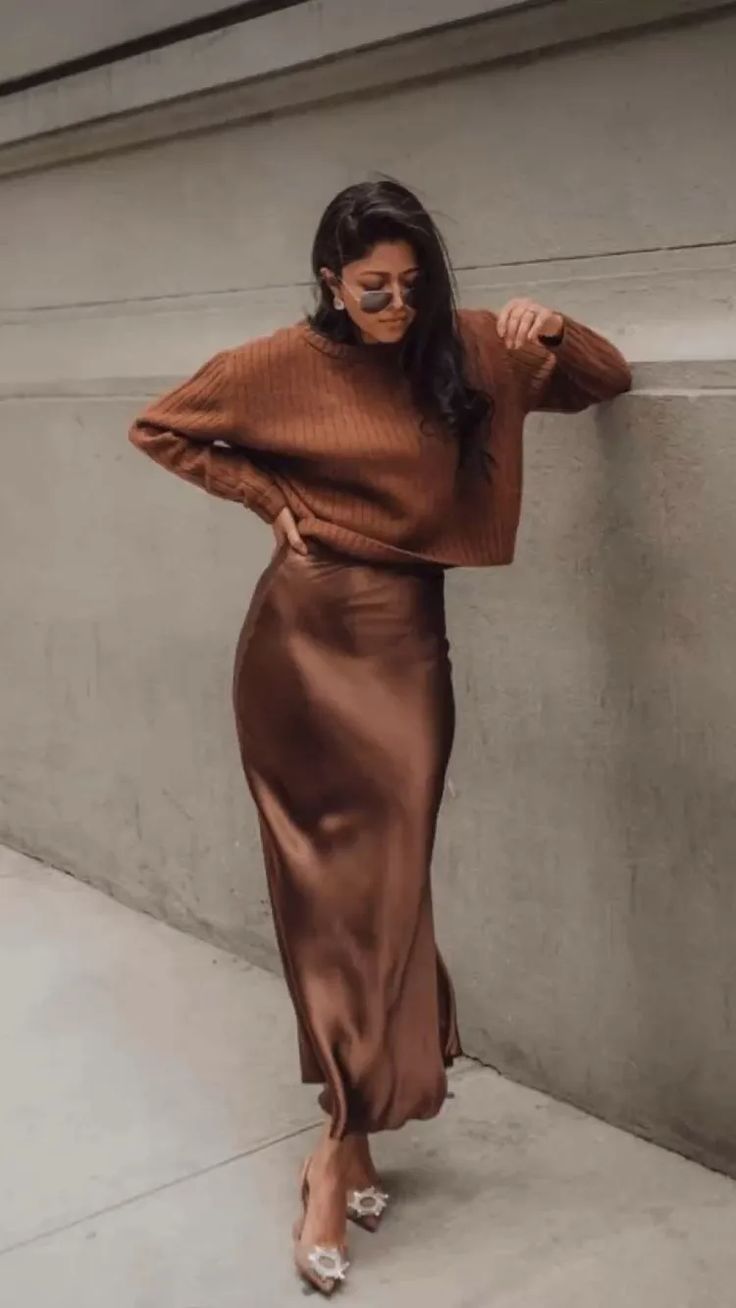Satin skirts make a statement with their fluidity and sheen. When coupled with an oversized sweater, the look is both luxe and lounge-worthy. Paired with embellished sandals, it’s a perfect ensemble for those warmer spring days.