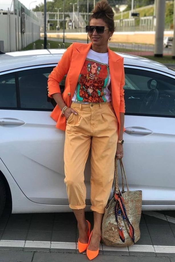 Here we see a masterful blend of bright colors and bold prints. An orange blazer adds a pop of vibrancy over a graphic tee, partnered with mustard trousers for a baddie spring outfits casual vibe that screams confidence. The outfit is impeccably finished with matching orange pumps and a statement tote, embodying a look that’s perfect for a baddie spring outfit for school or a day out in the city.