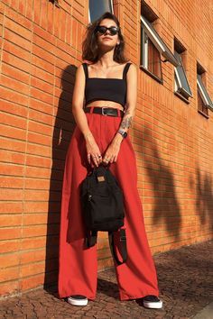 Stride into spring with these eye-catching red wide-leg trousers, signaling power and presence. The high-waisted cut, combined with a sleek black crop top, creates a silhouette that is both commanding and fashionable. A casual backpack and sneakers ground the look, making it an excellent example of a baddie spring outfits casual but edgy attire.