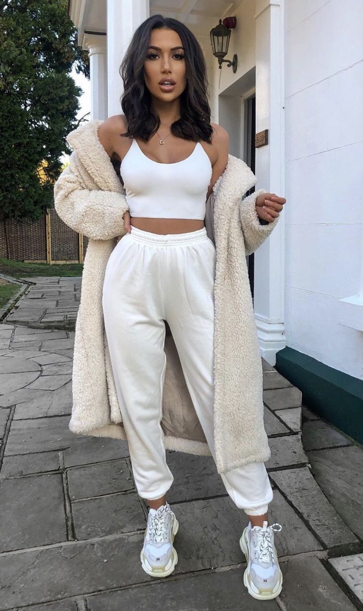 Spring can still bring a chill to the air, which is why this look is perfect. A plush, long coat drapes elegantly over a cropped top and high-waisted joggers, exuding a baddie spring outfits cold vibe. The mix of neutral tones with chunky sneakers gives off a relaxed, yet put-together aura, ideal for those transitional spring days.