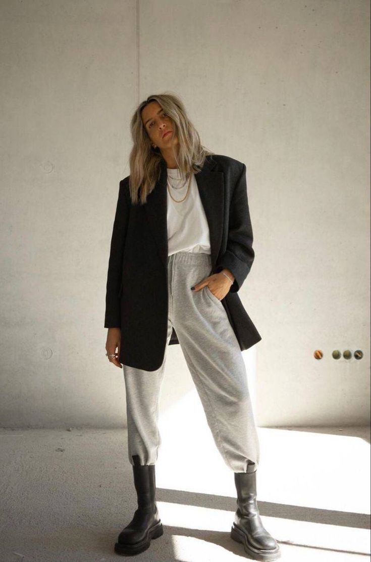 This ensemble showcases the sophisticated side of baddie attire. A tailored coat over a comfortable grey set combines professionalism with comfort. The look is completed with chunky boots, perfect for navigating both the bustle of the city and the chill of early spring mornings.