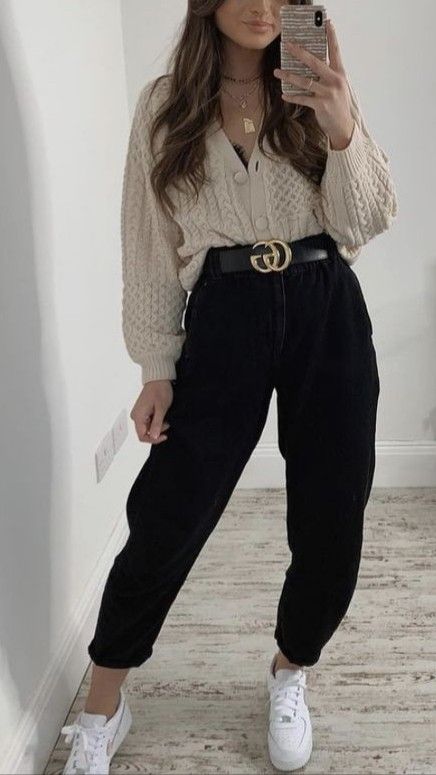 This outfit pairs a cozy knit with sleek black jeans, a combination that provides warmth and style—a perfect baddie spring outfits cold choice. Accented with a designer belt and classic sneakers, it’s a look that brings elegance to everyday attire.
