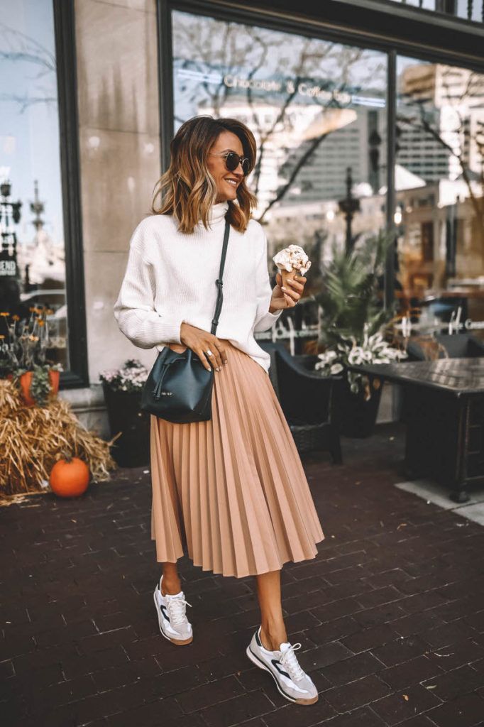 Soft pastels like peach and cream are a breath of fresh air this spring. A pleated midi skirt paired with a cozy knit sweater and trendy sneakers makes for a delightful spring fashion trend for women over 50 outfit ideas, blending comfort with sophistication.