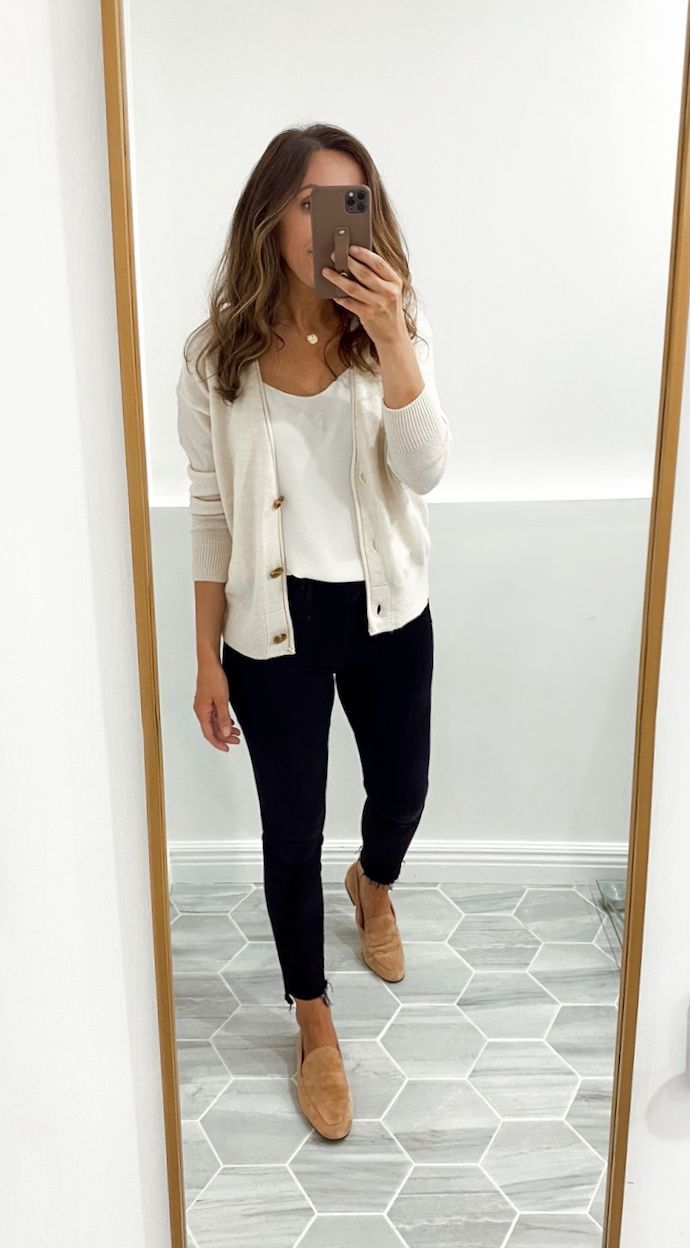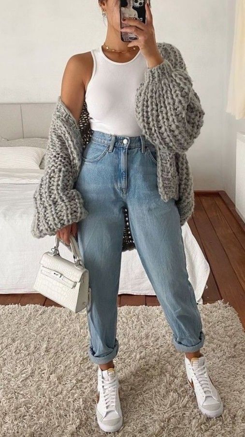 This season, the everyday outfits of choice for the sophisticated woman blend comfort with chic. Neutral knits are taking over, as seen in the beige chunky cardigan paired with classic blue jeans and a simple white tank. It’s a testament to the spring fashion trends for women looking for an easy transition from winter to spring.