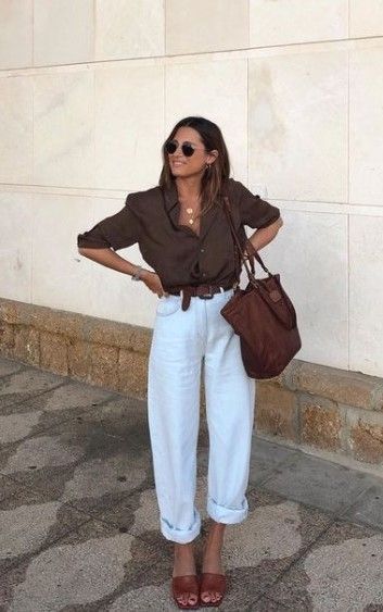 A relaxed brown blouse with light denim is an effortless way to incorporate the spring fashion trends for women into your wardrobe. This look is versatile and suitable for women enjoying the current styles at any age.