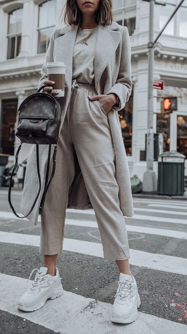 The trend of neutrals continues with a focus on taupe and beige. This head-to-toe neutral outfit, complemented by white sneakers, is versatile and can be dressed up or down, aligning with the spring fashion trends for women over 40 who value versatility in their wardrobe.