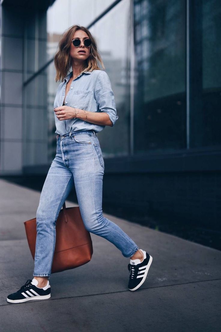 The Canadian tuxedo gets a fresh facelift this spring. Light-wash denim paired with classic black sneakers represents the spring fashion trends women love for their adaptability and comfort. This look speaks to the everyday outfits that are both stylish and practical.