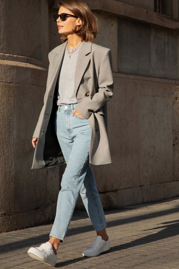 A staple in spring fashion trends for women over 40, the trench coat is seen reimagined with a modern twist. This season introduces a light grey trench, fluid in fabric and cut, teamed with casual denim and crisp white sneakers. It’s a look that speaks to women who admire current trends while appreciating timeless pieces.
