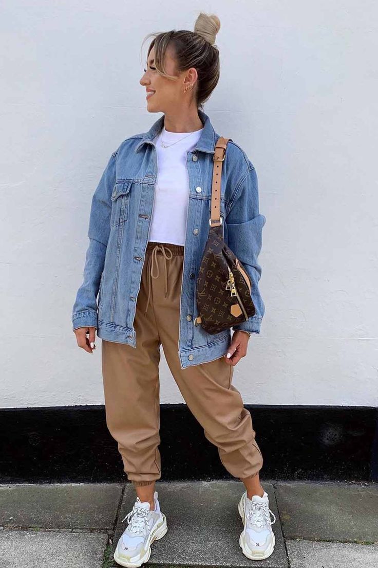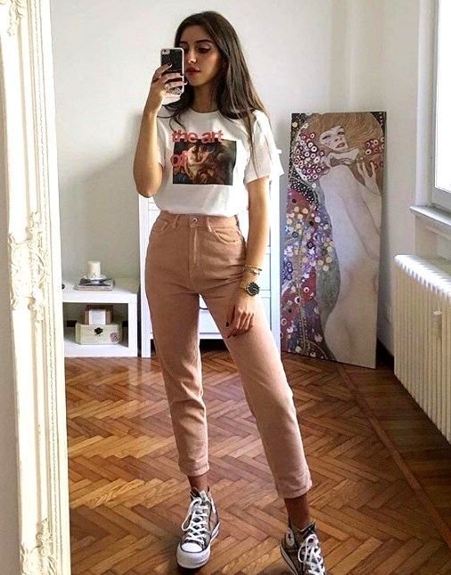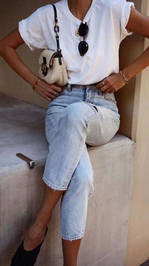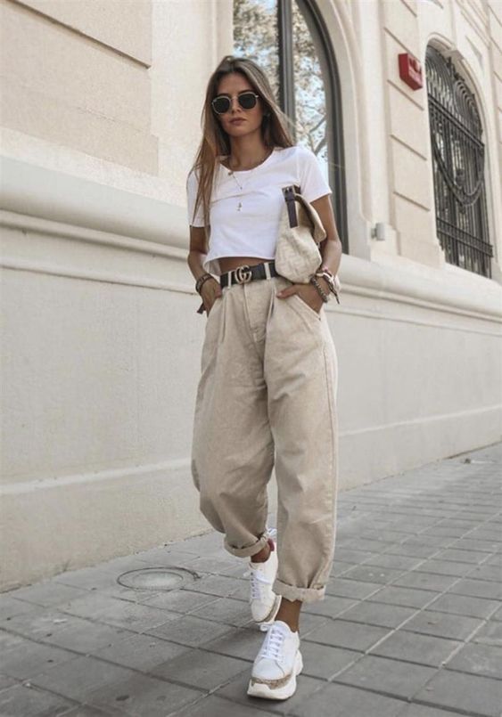 For the urban fashionista, the spring jeans outfit casual styles classy takes a sophisticated turn with a structured, beige high-rise pant combined with a crisp white tee. Accents like a bold designer belt, a chic shoulder bag, and white sneakers add a touch of polished finesse to this casual ensemble.