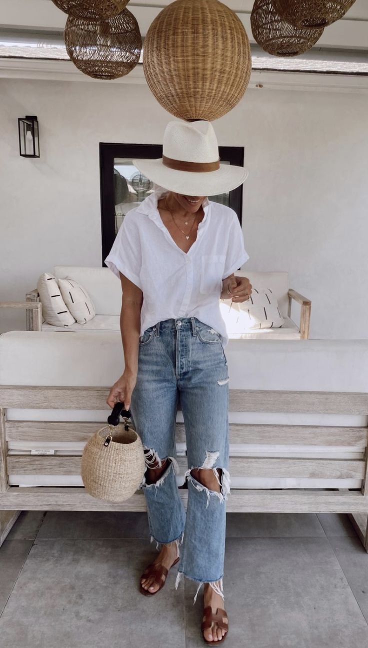 In the spring jeans outfit collection for 2024, there’s a particular focus on the breezy, bohemian aesthetic that echoes the laid-back vibe of coastal living. Imagine a pair of distressed, light-wash jeans paired with a loose, airy white linen blouse. This outfit, complemented by a wide-brimmed straw hat and simple leather sandals, speaks to a sense of effortless grace and casual comfort.