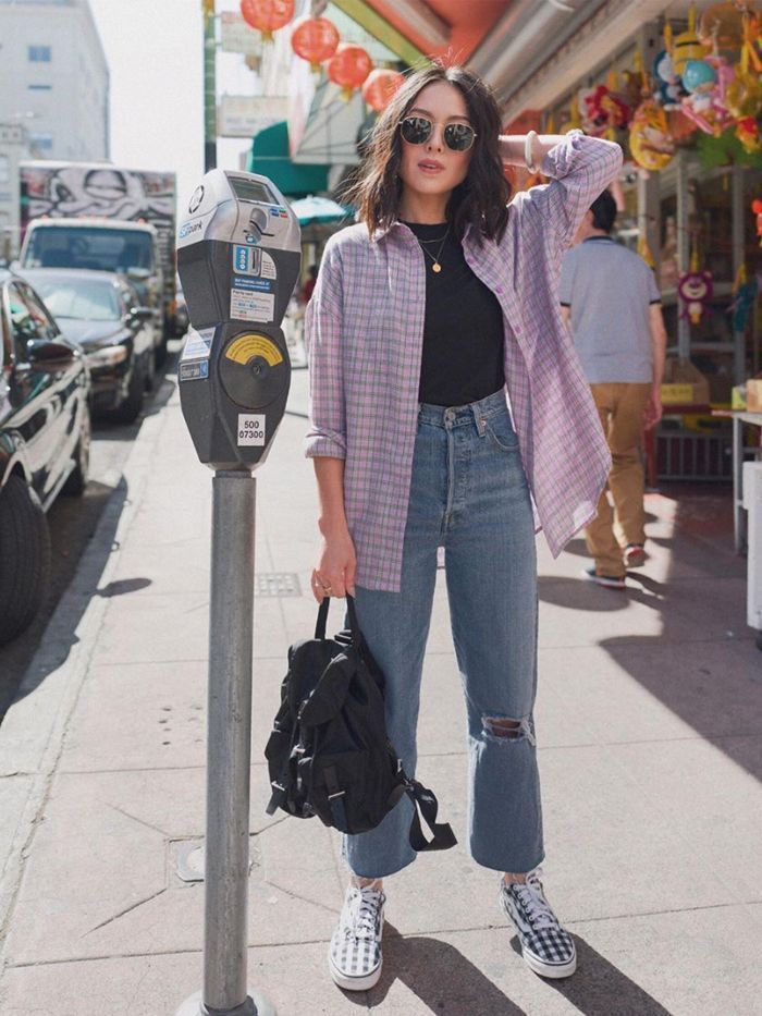 Moving into the realm of spring jeans outfit work, consider a look that’s suitable for a creative workplace or a casual Friday. Think of a straight-leg jean with a raw hem, lending an edge to your ensemble. Pair it with a soft, plaid overshirt and a black inner layer for that street-smart aesthetic, complete with a pair of checkered sneakers to add an extra touch of attitude.