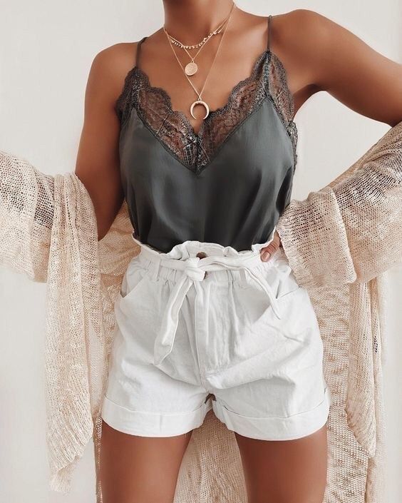 This striking image is a symphony of textures, perfect for the summer fashion style outfits. It showcases a delicate balance between luxury and casual, with a silky, lace-trimmed camisole and airy white shorts.