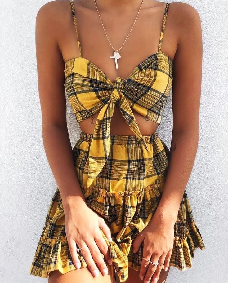Summer fashion style outfits shine with vibrant patterns and textures, and this ensemble is no exception. The coordinated plaid set exudes a sunny disposition, perfect for the fashion-forward woman ready to embrace the heat in style.
