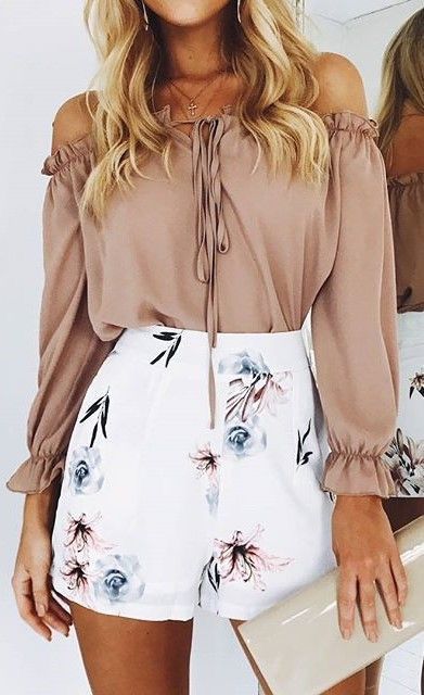 This picture represents a playful and romantic approach to summer fashion style outfits. The off-shoulder blouse paired with floral shorts combines feminine details with a breezy silhouette for an enchantingly flirty look.