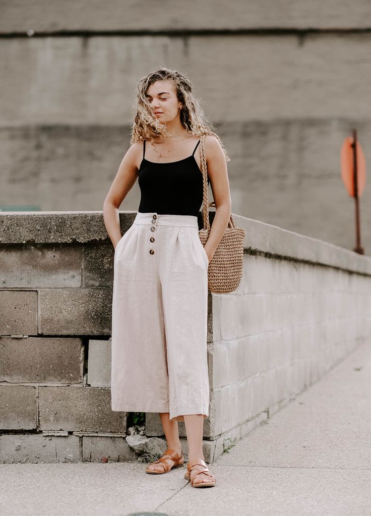 In the tranquil whispers of summer fashion styles for women over 50, chic simplicity takes center stage. This image is a testament to the ageless charm of minimalism. A classic black tank top is smoothly tucked into wide-legged, buttoned linen trousers, creating a silhouette that is as flattering as it is comfortable.