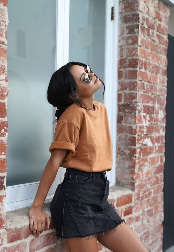 Channeling the essence of fashion week street style summer, this image captures a nonchalant coolness that’s both urban and trendy. The combination of a relaxed rust-hued top and a black denim skirt presents an effortlessly stylish vibe.