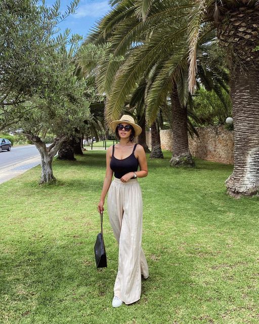 In the verdant embrace of Palm Springs’ landscape, a classic palm springs outfit summer look captures the ease of desert living. Here, we see a model donning a sleeveless black top tucked into flowing linen trousers. The ensemble speaks to the simplicity of summer with a nod to timeless sophistication. Accessorized with a wide-brimmed straw hat, sleek sunglasses, and a minimalist black handbag, the outfit is a testament to the understated elegance that thrives under the Californian sun.