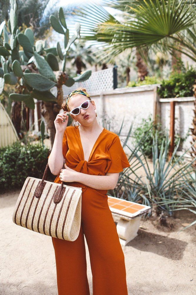 Here we find the epitome of a Palm Springs outfit summer – a white tie-front romper that is both chic and effortless. This look is the perfect canvas for bold accessories, like the statement white sunglasses and the wooden clutch. It’s a reminder that sometimes, less is indeed more, especially under the Palm Springs sun.